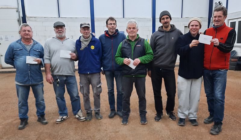 Ausgeschrieben war das Einbollen-Abschlussturnier am 14.10.2023 als Ranglistenturnier und es hatten sich 34 von möglichen 52 Teams (auf Grund der vorhandenen Plätze) angemeldet. Alles war super vorbereitet, die Plätze gerichtet, das Catering, die Einschreibung, der Schiedsrichter vor Ort…und dann dieses Wetter. Ausgerechnet an diesem Samstag kam der Regen und hielt damit einige gemeldete Teams ab nach Denzlingen zu kommen. So waren es bei Einschreibschluss nur 28 Teams. Zu wenige für ein Ranglistenturnier. Anstatt Poule A-B, wurden 5 Runden Schweizer System mit Buchholzpunkten gespielt. Trotz des immer wieder einsetzenden Regens kam es zu spannenden Spielen und kein Team wollte vorschnell Punkte verschenken, um in die trockene Boulehalle zu gehen. Nach der 4. Runde führten Harald und Nico Öschger die Platzierungsliste mit einem Feinbuchholzpunkt mehr vor Christian Bossert und Philippe Jankowski an. In der letzten 5. Runde bekamen die Zuschauer ein spannendes und packendes Spiel zu sehen, welches Harald und Nico Öschger mit 13:11 für sich entscheiden konnten. Die Ausschüttung der Preisgelder ging an die Plätz 1- 8. Hier die Platzierungen: